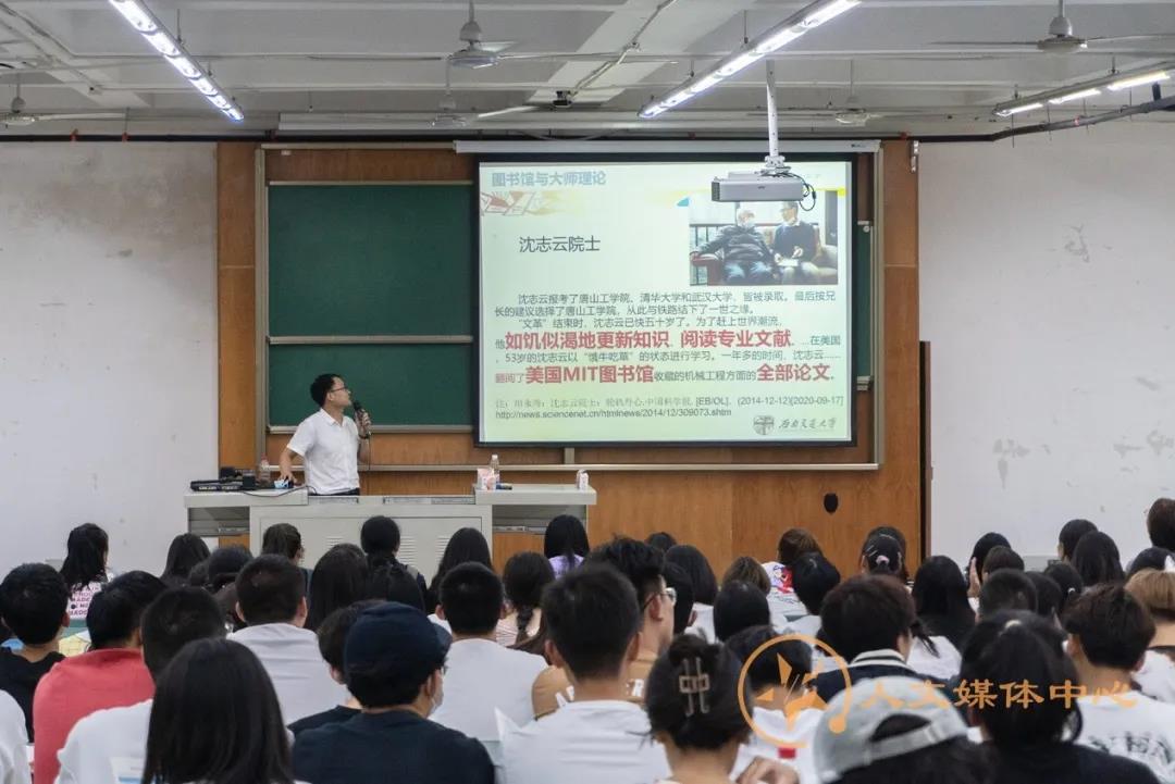 的新生做入馆教育,有很别样的感触。入馆教育主要从三个方面进行,介绍几个人、认识一个馆、骑上几匹“码”。孙老师首先介绍了机车车辆专家沈志云院士、CCTV财经频道特约评论员刘兴亮、“竢实扬华”奖章获得者姚铭等优秀校友与图书馆的故事,他们的成功与热爱学习、喜欢读书是密不可分的。随后孙红林老师从1896年图书馆建立讲起,图文结合,声容并茂,将交大图书馆百年的历史画卷呈现在同学们的眼前。接下来,孙老师给出了西南交通大学图书馆公众号、中国大学MOOC等平台的二维码,讲解了预约入馆、借阅和还书流程、馆际互借等相关操作,还向大家推荐了一些资源站点和竞赛。最后,孙红林老师留下了联系方式,鼓励同学向他咨询图书馆的相关问题或讨论读书心得。